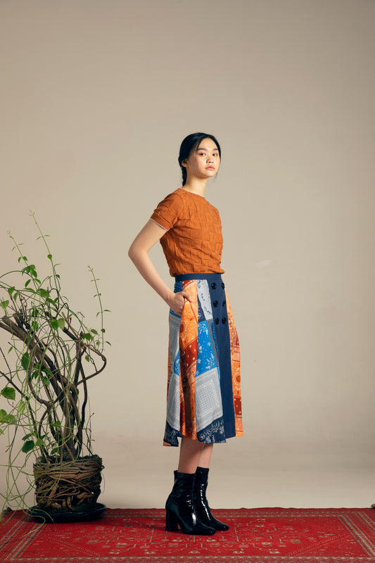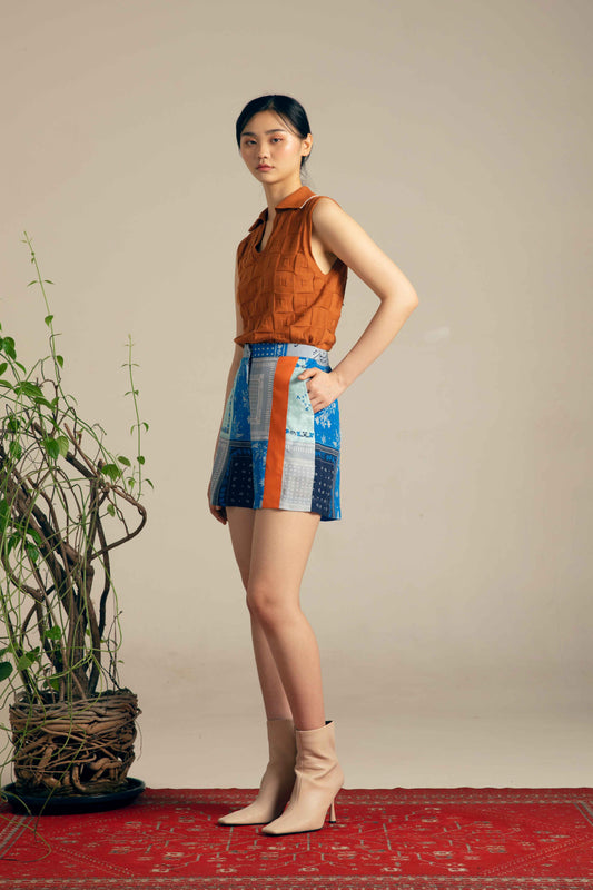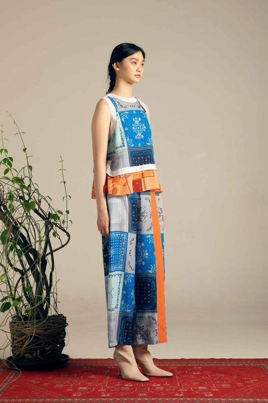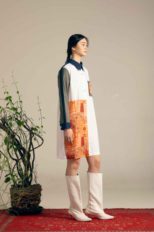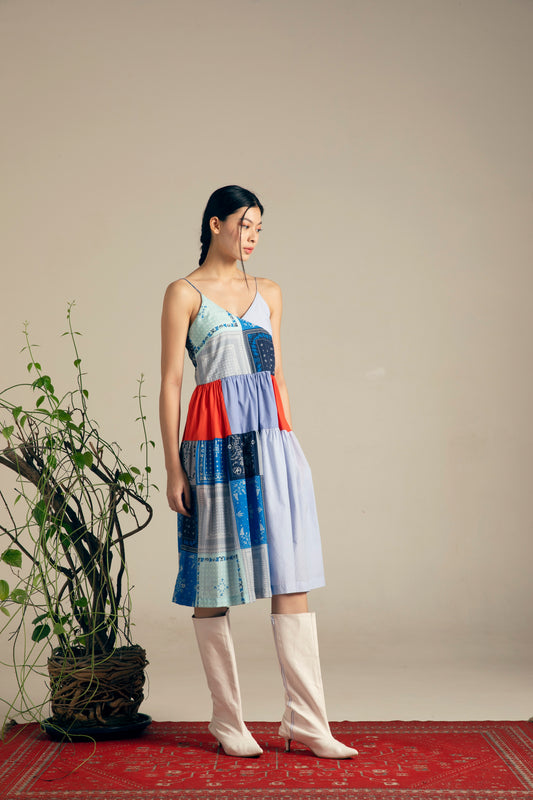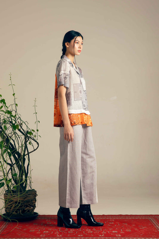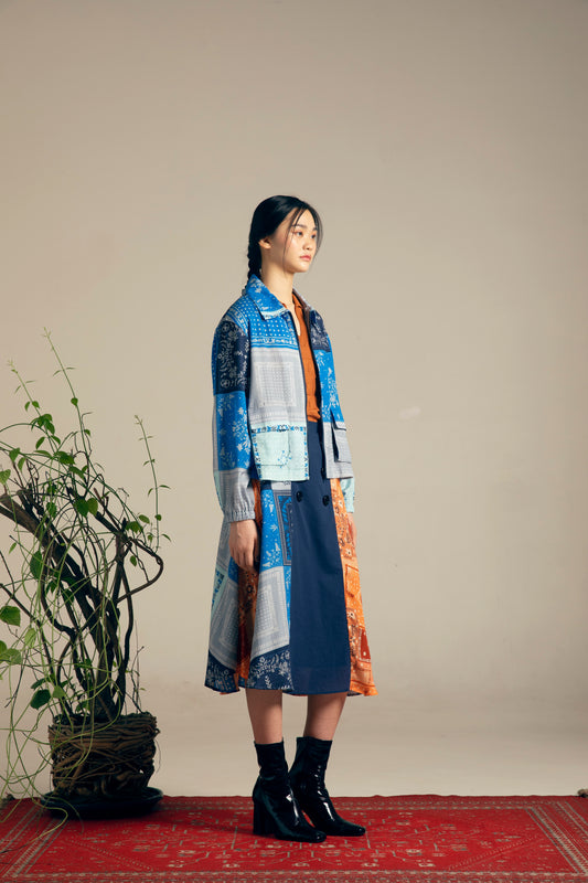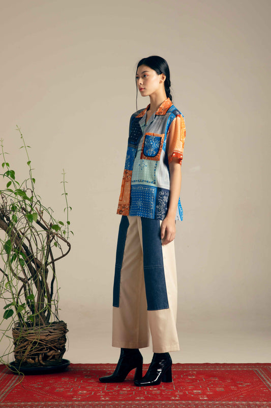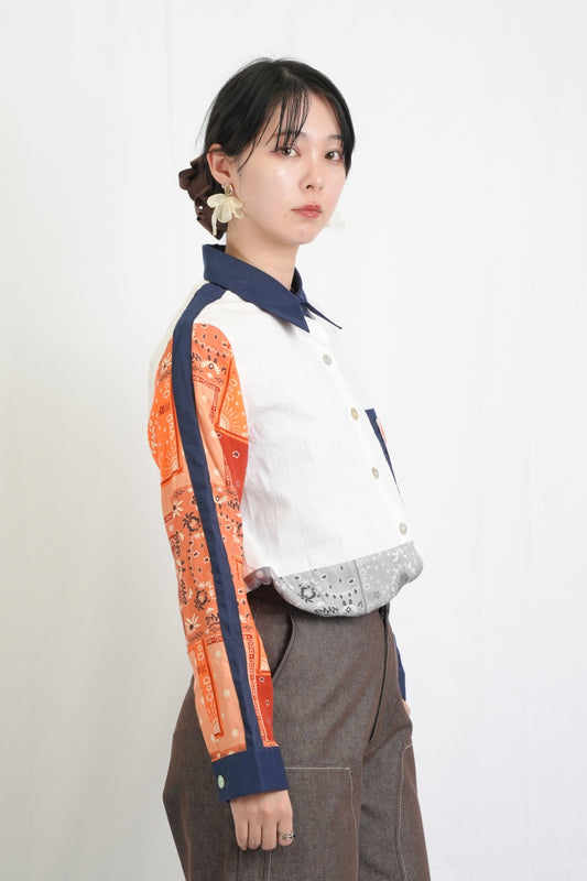 バイカラーバンダナ柄パッチワーク風オープンカラーシャツ