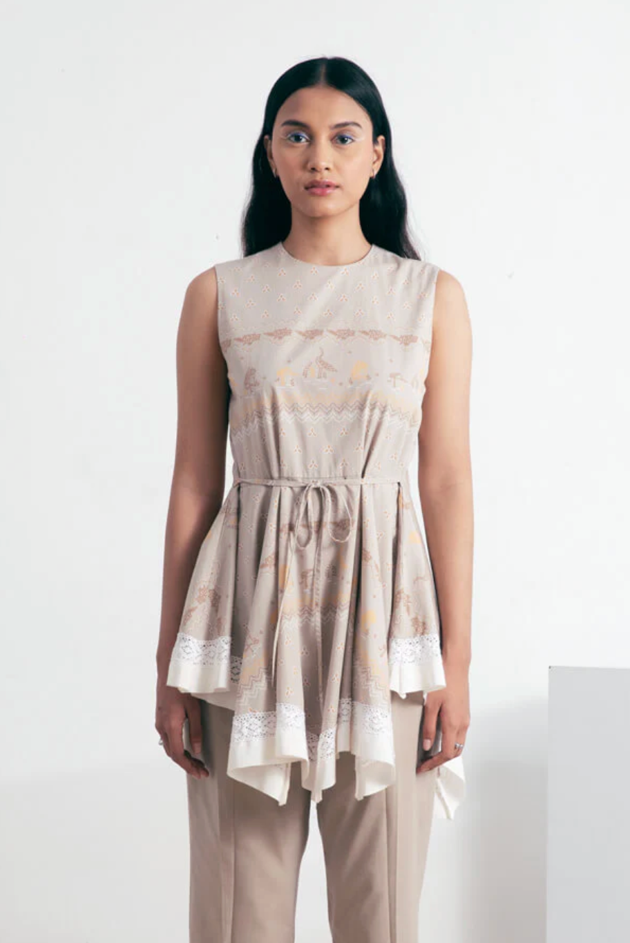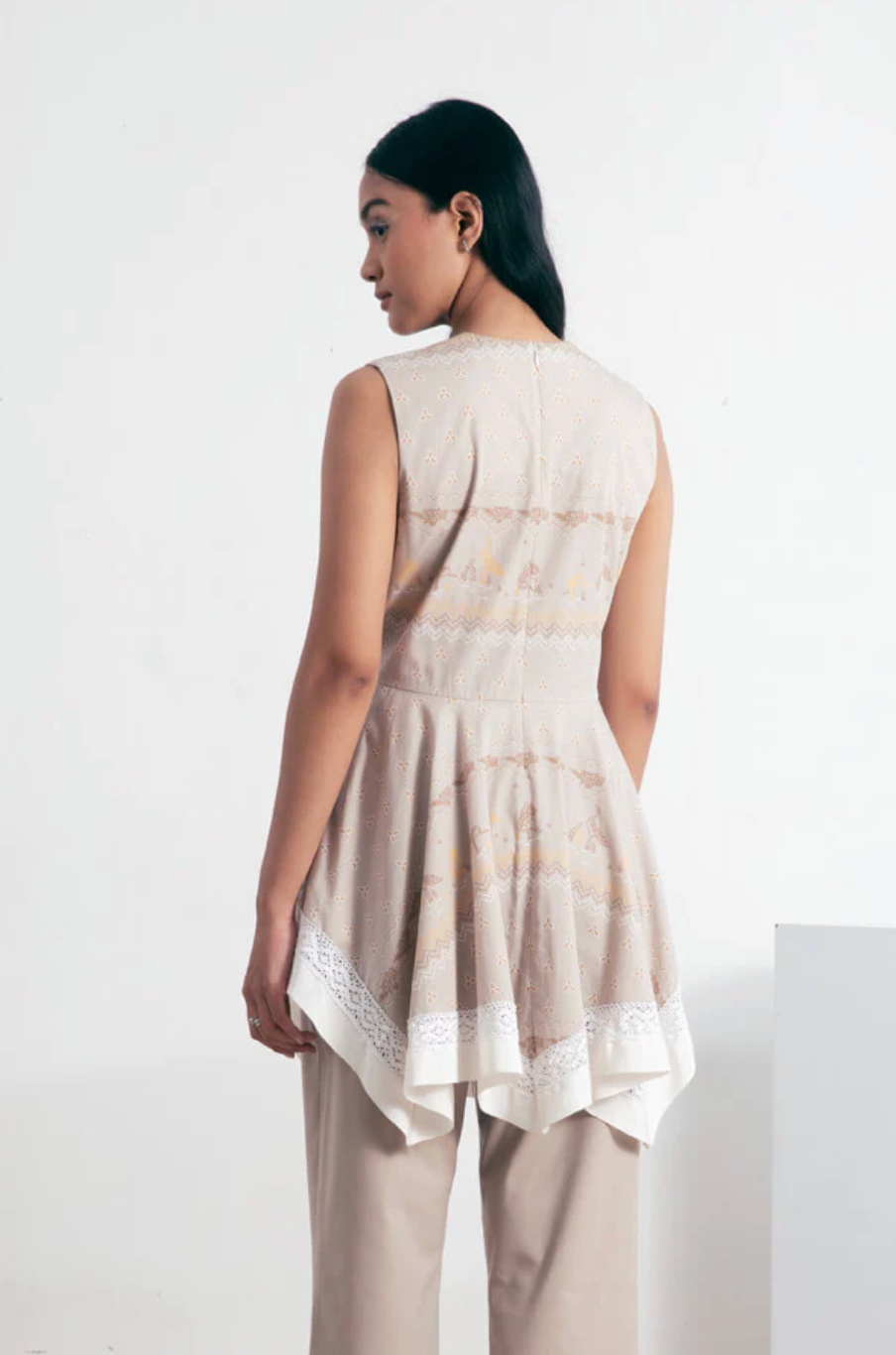 裾はアシンメトリーに広がるデザインで、動くたびにふんわりと揺れる軽やかな印象に。