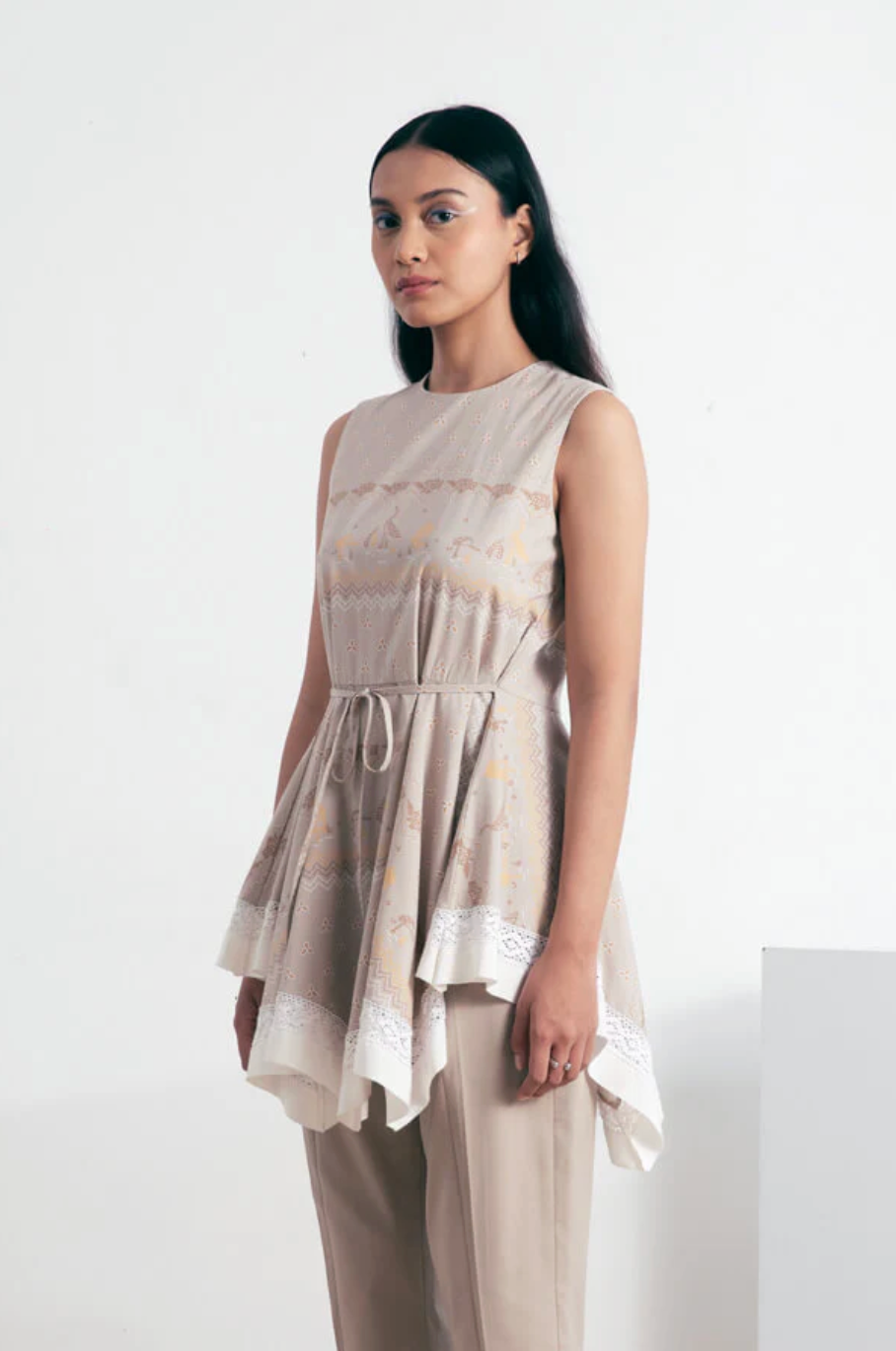 裾部分にあしらわれたレーストリムが上品なアクセントとなり、ナチュラルながらも華やかさを添えます。