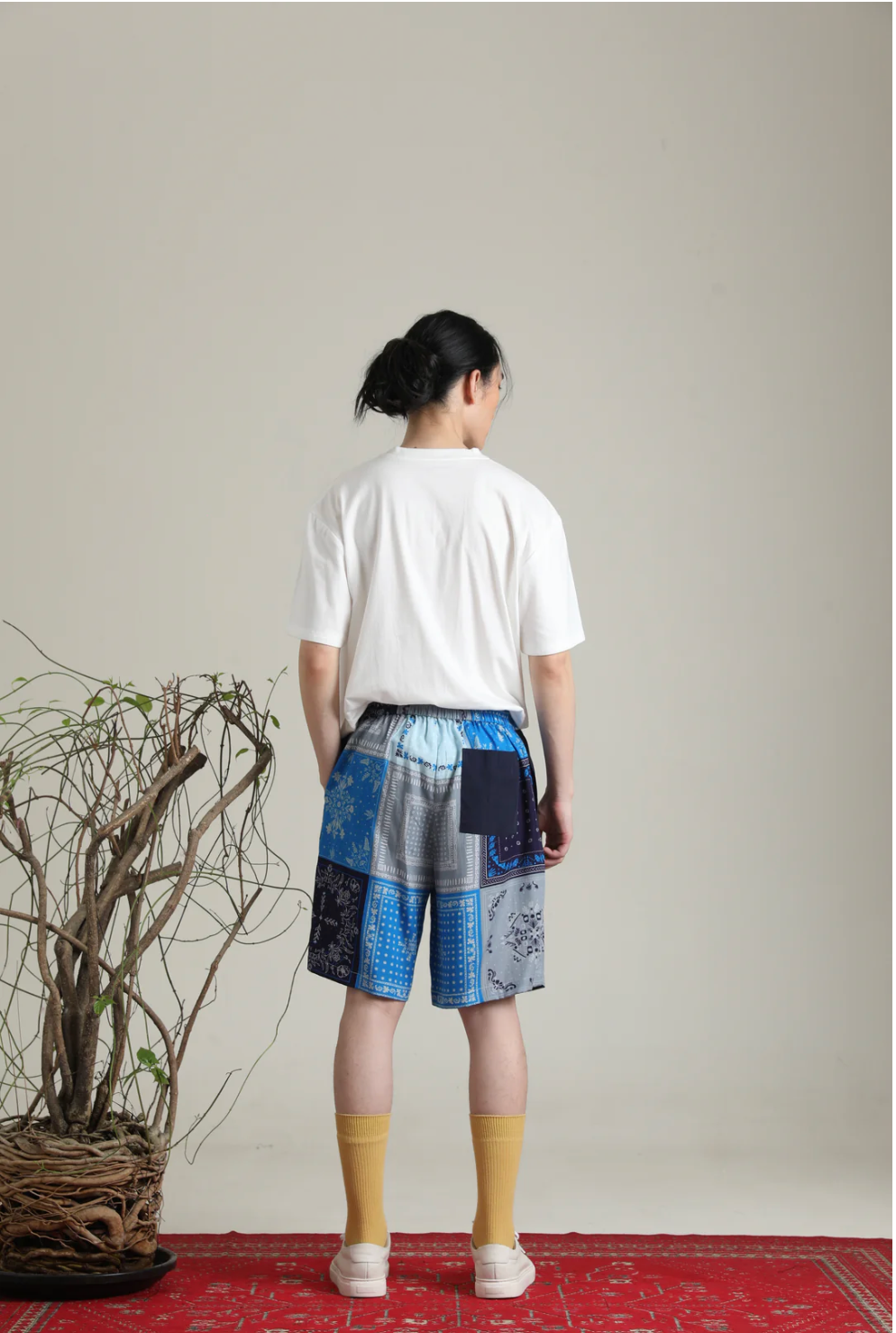 複数のブルートーンのバンダナ柄を組み合わせた、存在感抜群のショートパンツ。
