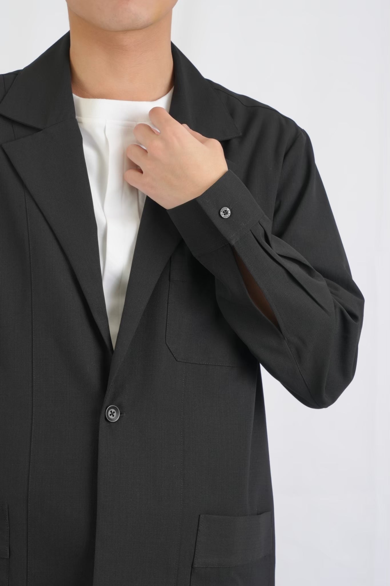 袖口にはスリットとボタンをあしらい、軽やかな抜け感をプラス。