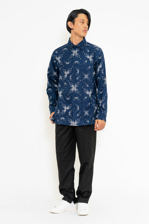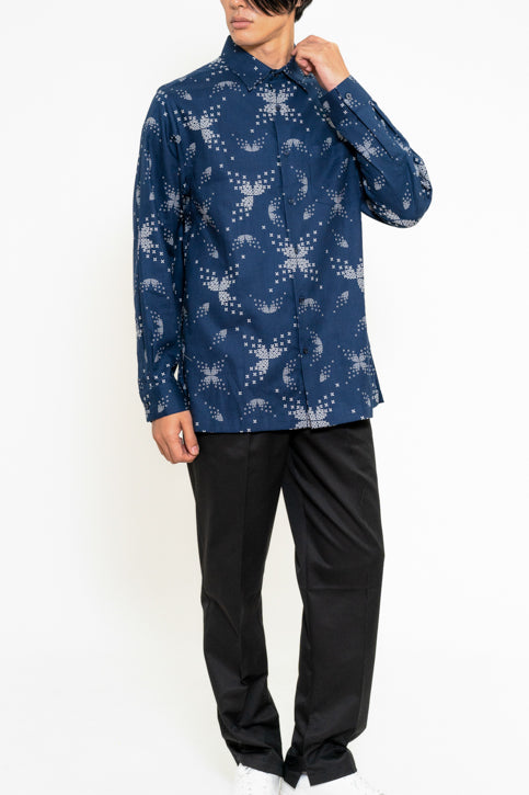 ネイビー地に繊細なドット調の模様をあしらった長袖シャツ。
