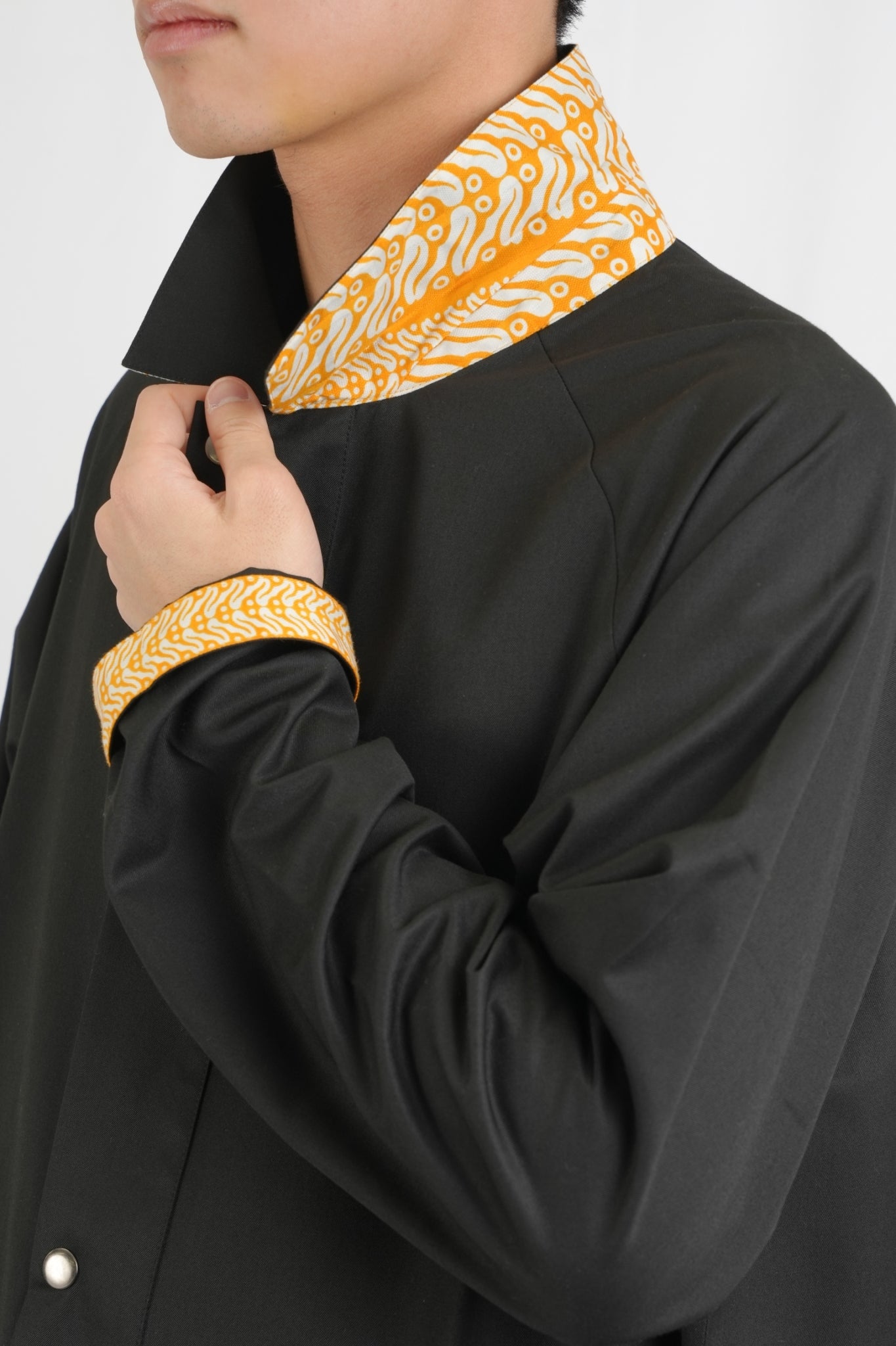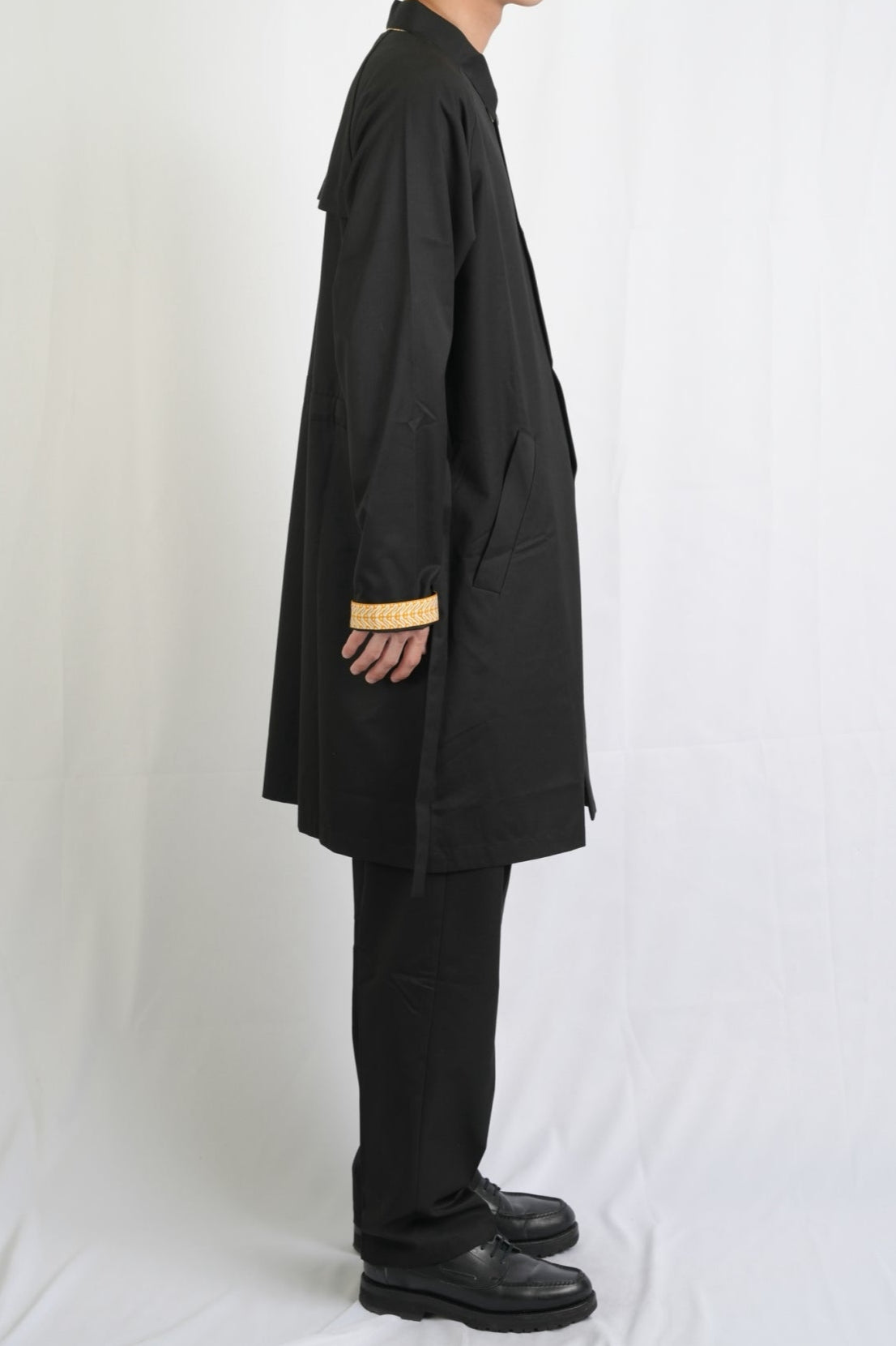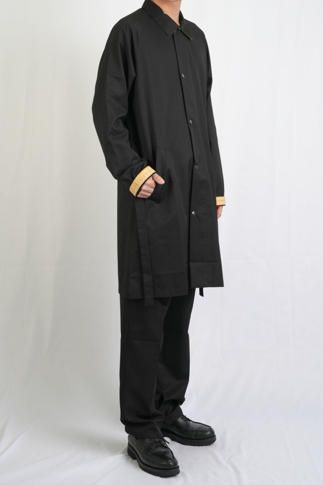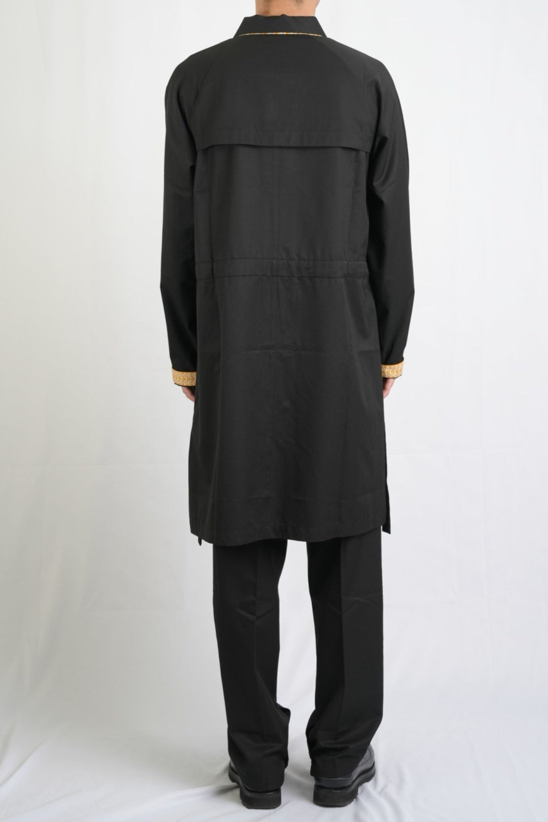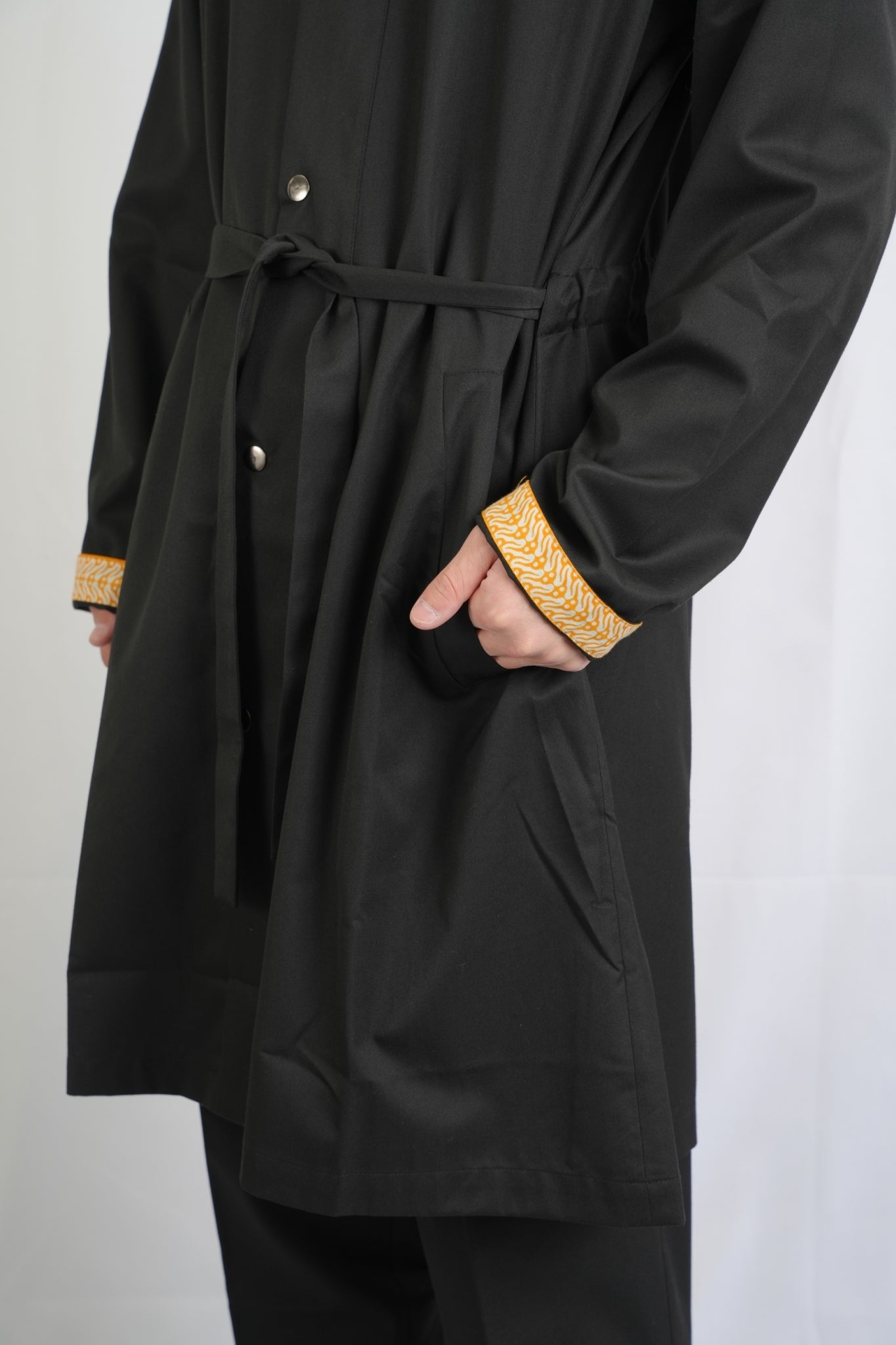 シンプルなブラックのロングコートに、バティック調の刺繍をあしらったアクセントが光る一着。
