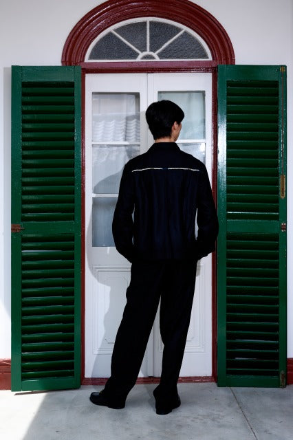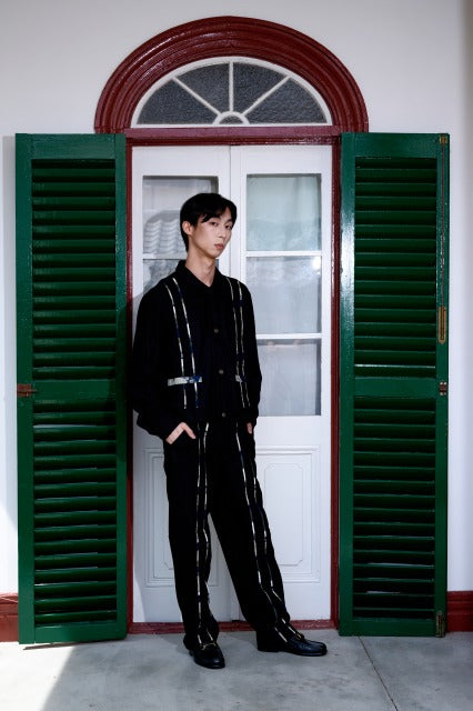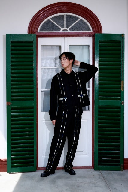 縦方向に施されたラインディテールが印象的な深い黒を基調にしたパンツ。