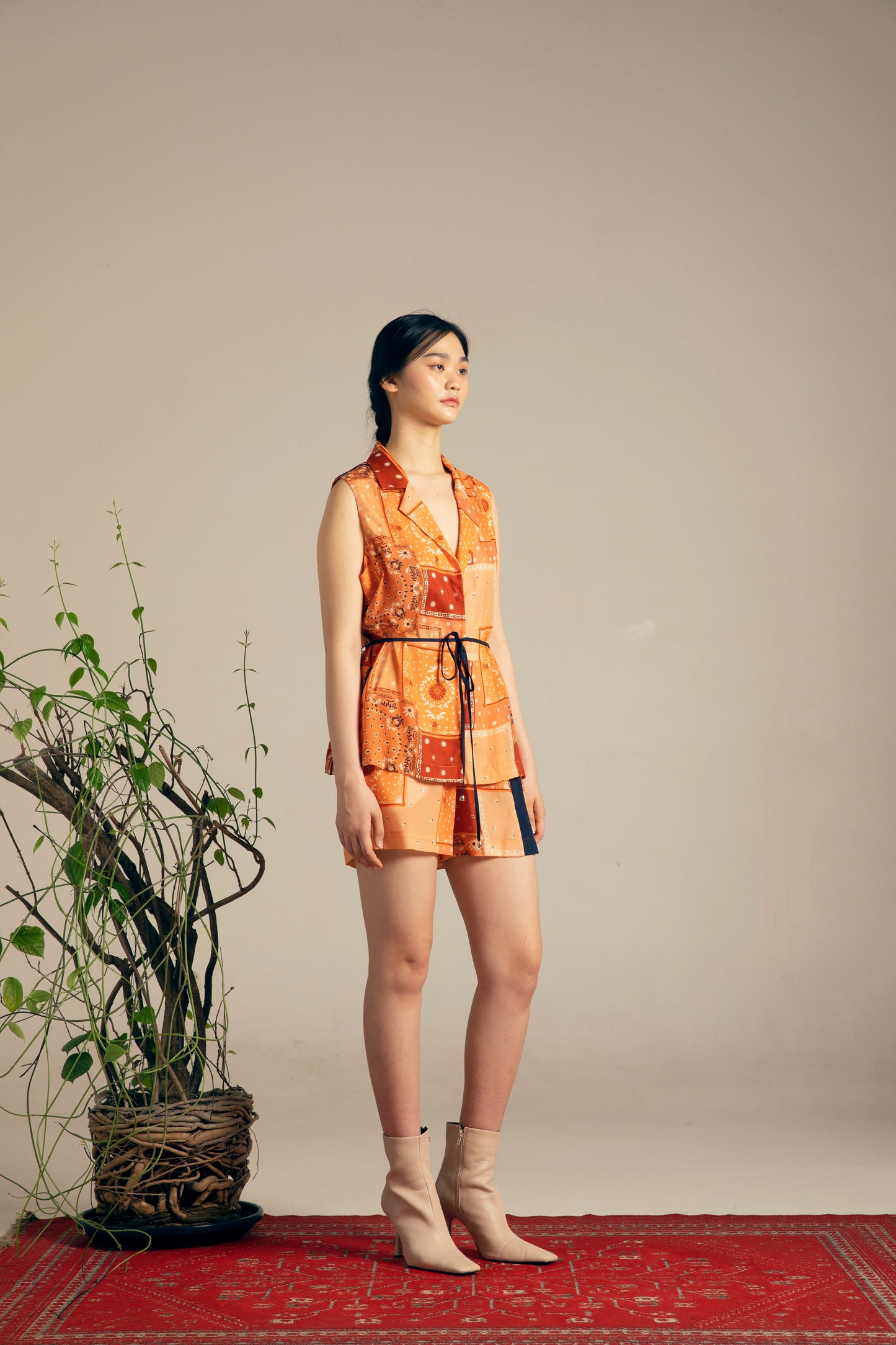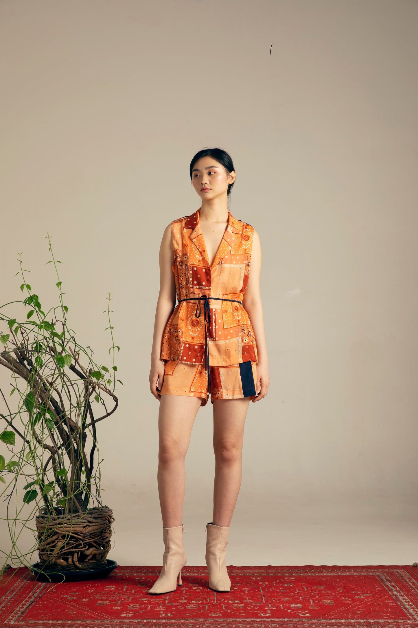 オレンジを基調とした暖色系カラーに深いブルーのアクセントが加わり、モダンな印象を演出します。視覚的なインパクトがありながらも、上品でバランスの取れた配色が特徴です。