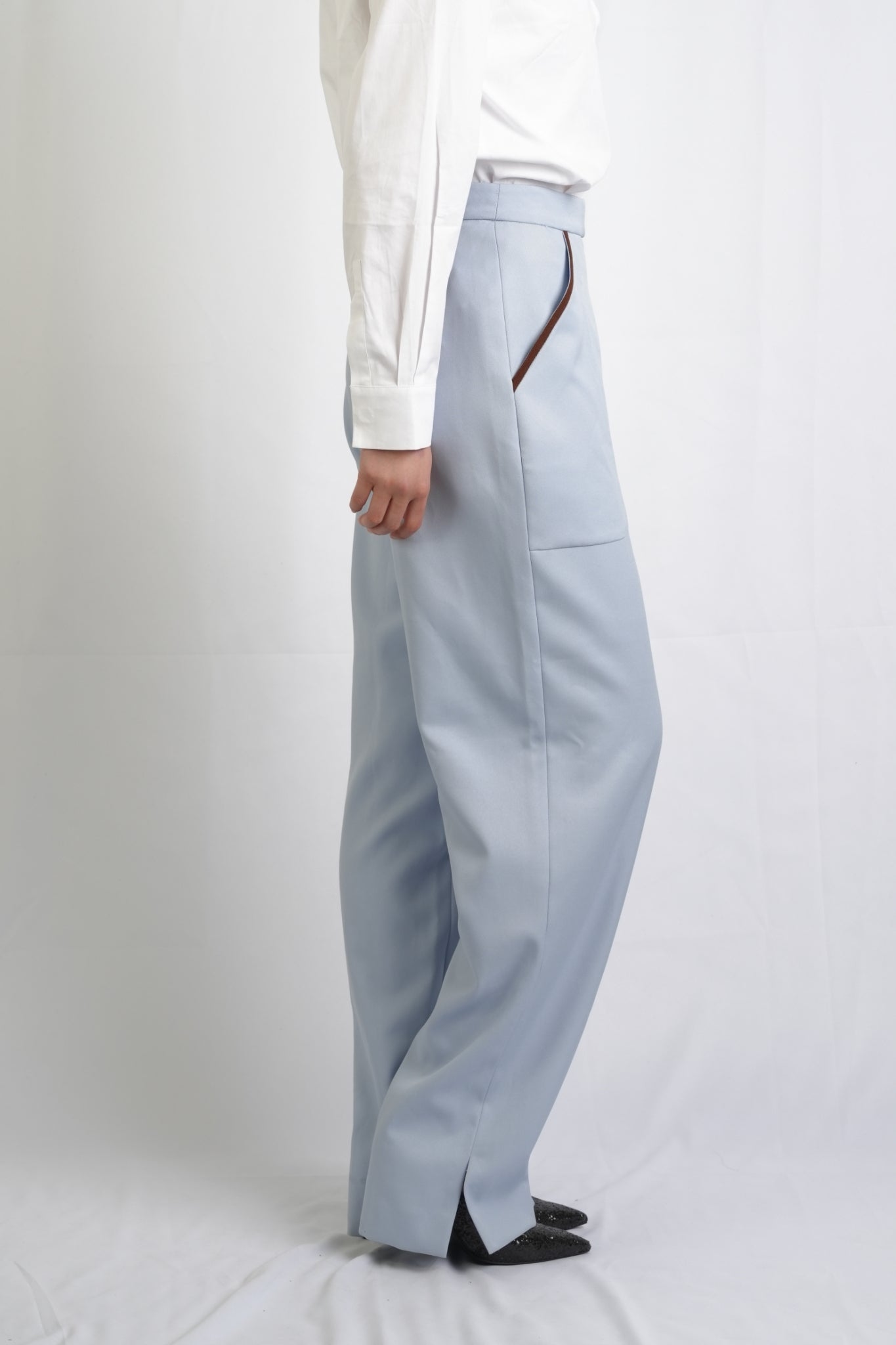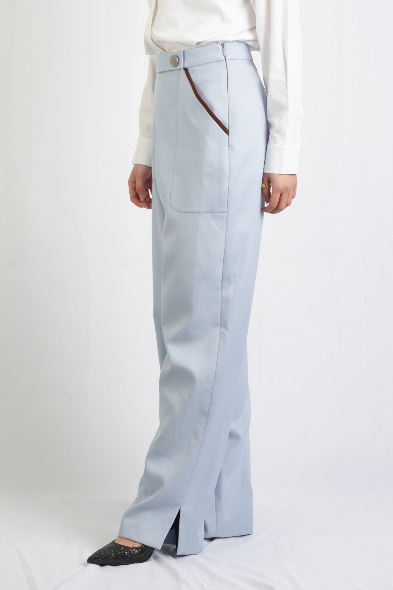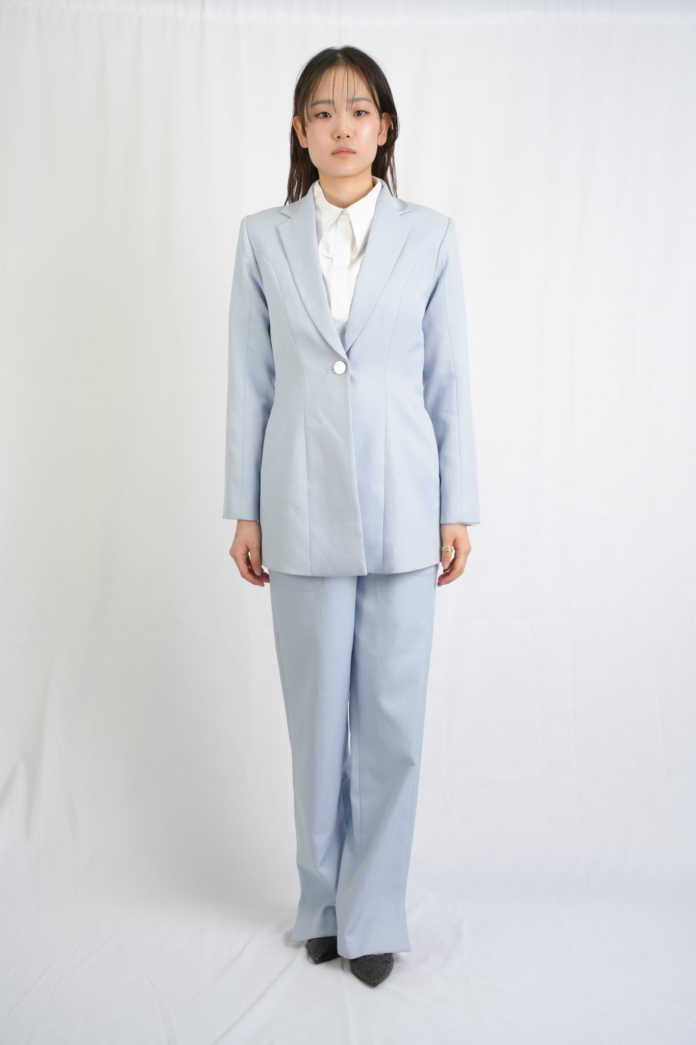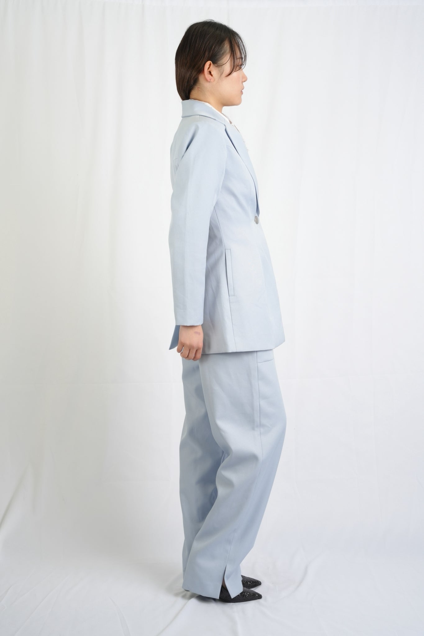 淡いブルーのカラーは、上品で落ち着いた印象を与える一方で、都会的で洗練された雰囲気も演出しています。この色味は、フォーマルにもカジュアルにも合わせやすい万能なトーンです。