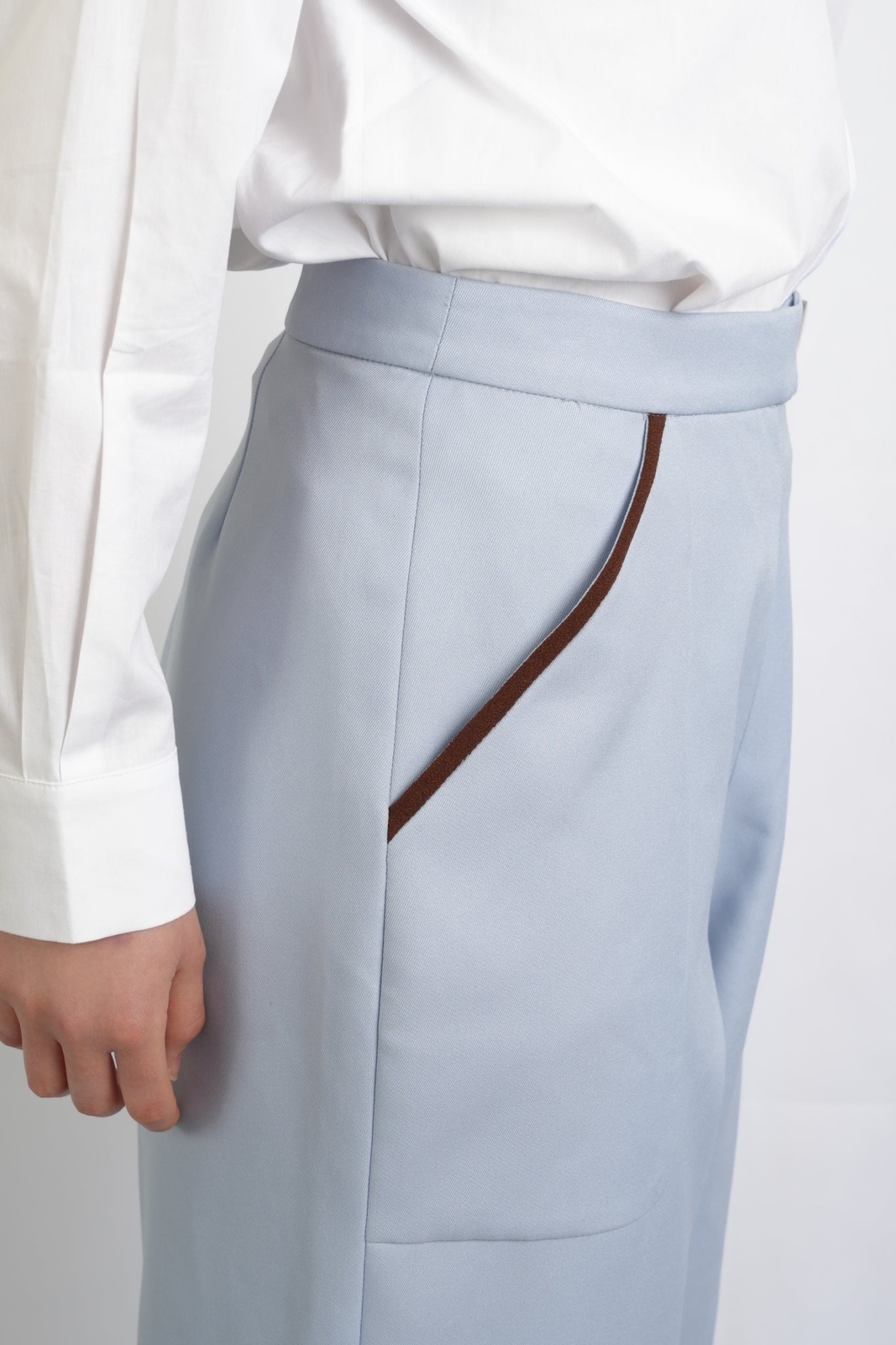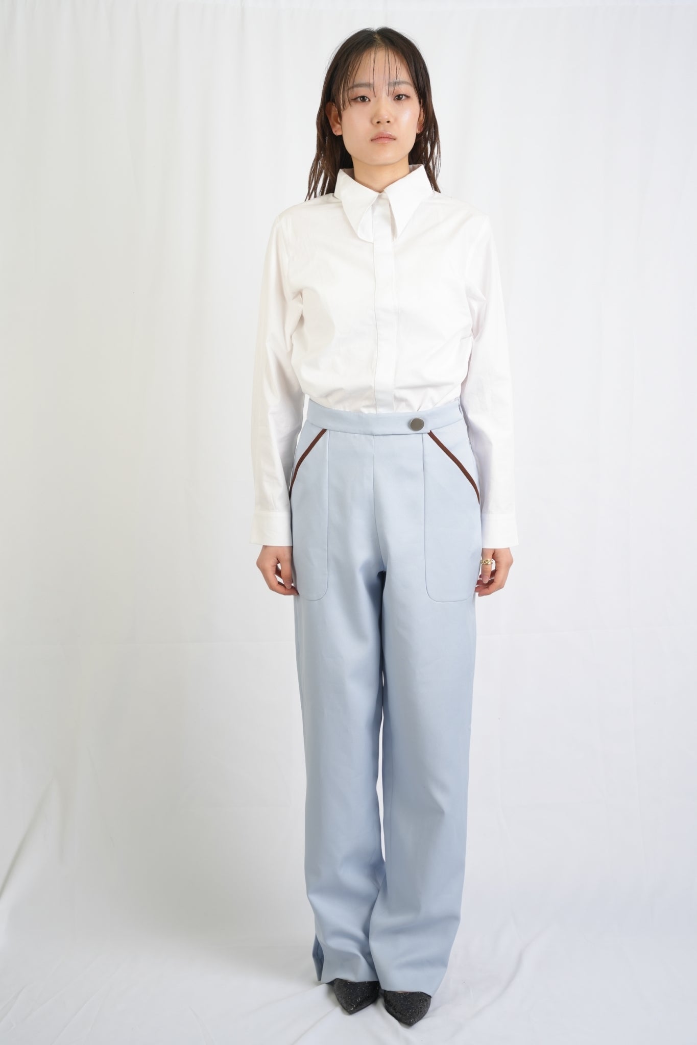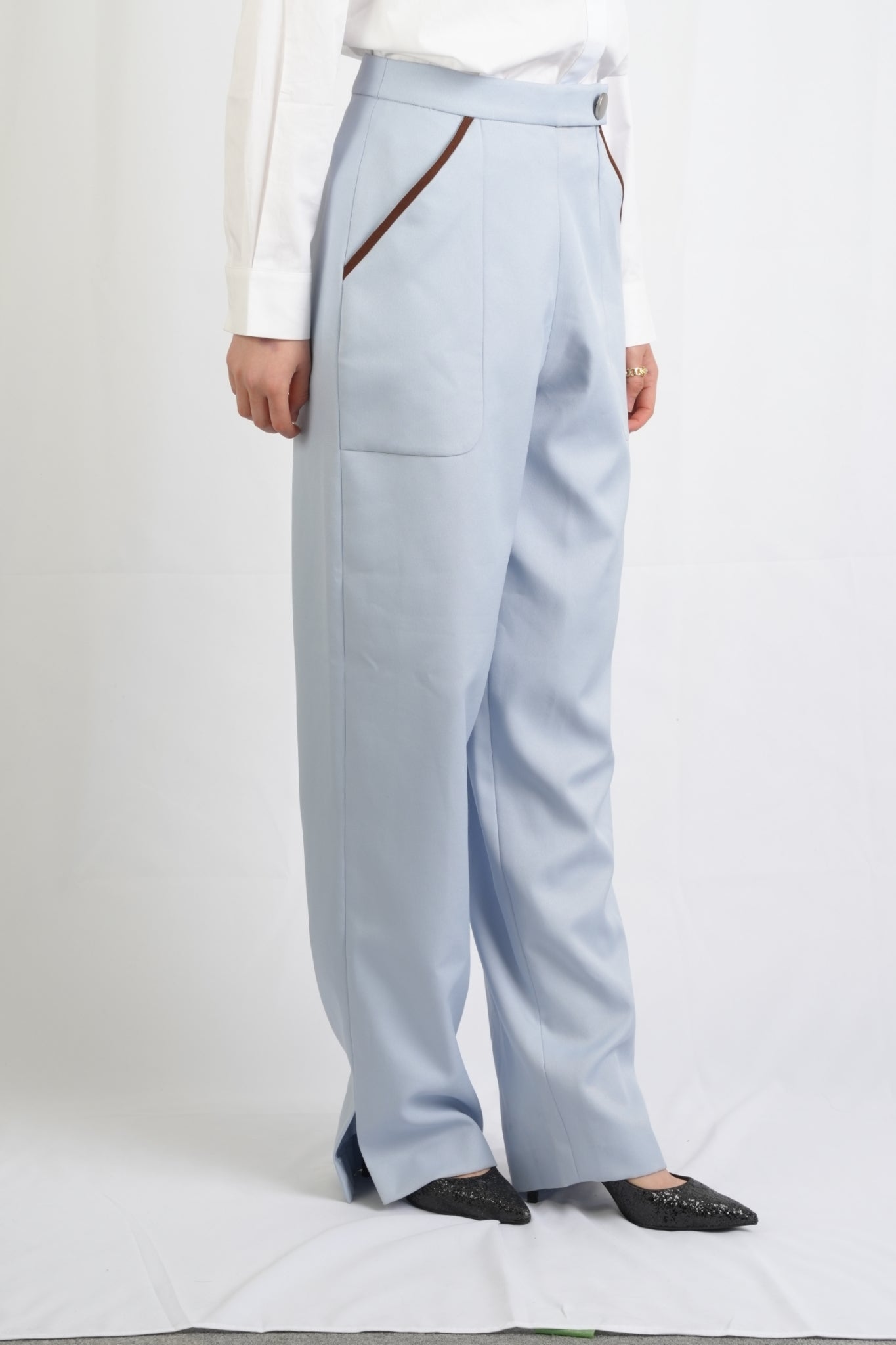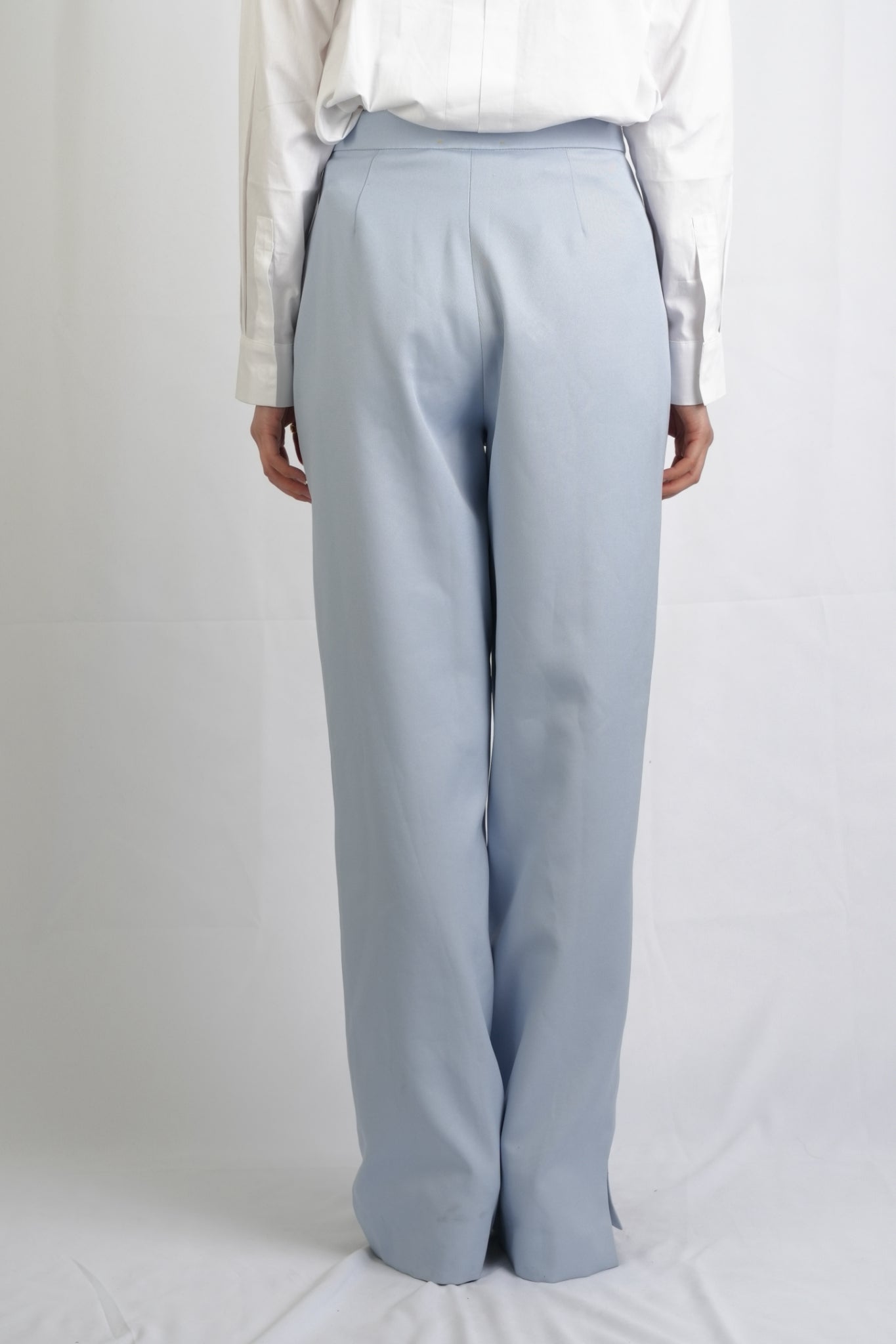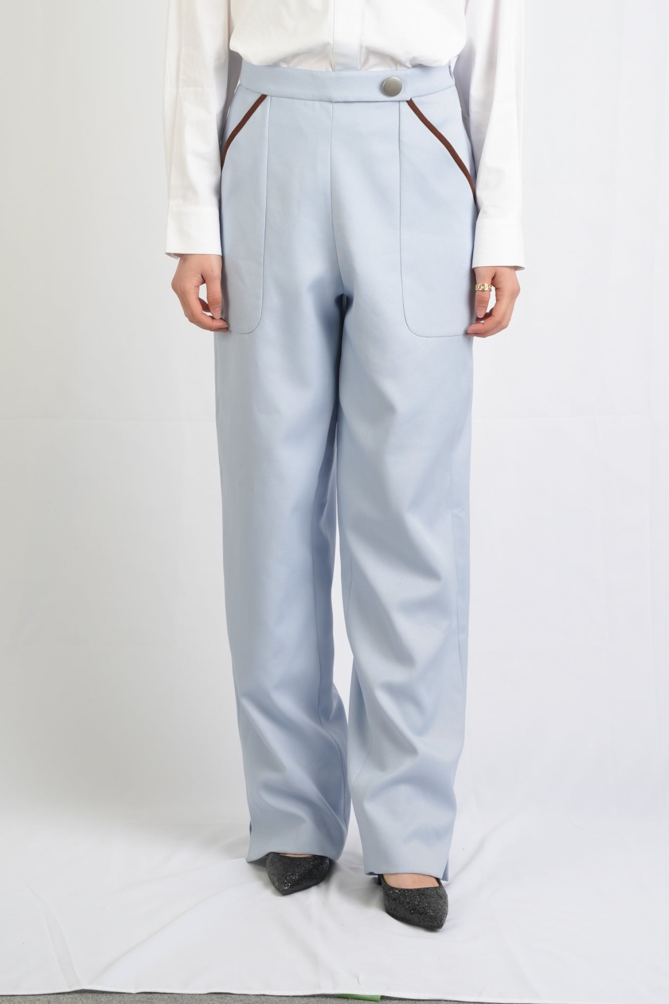 淡いブルーのカラーは、上品で落ち着いた印象を与える一方で、都会的で洗練された雰囲気も演出しています。この色味は、フォーマルにもカジュアルにも合わせやすい万能なトーンです。