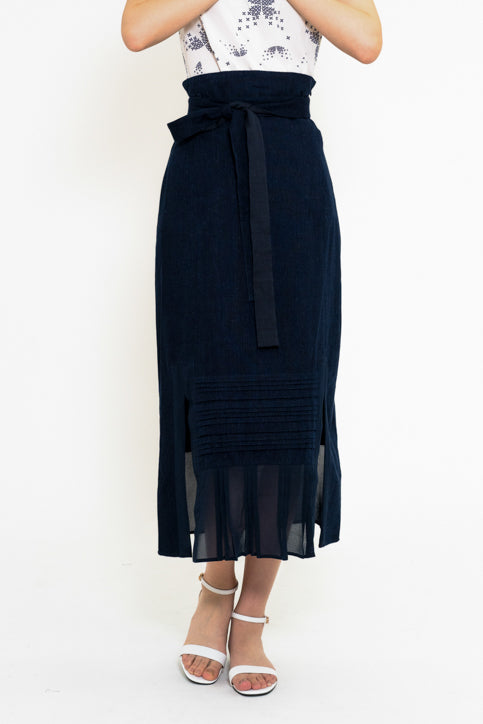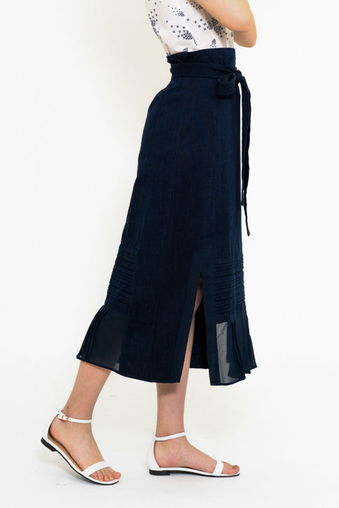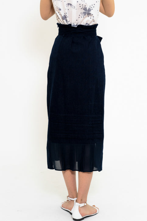深みのあるネイビーカラーが上品な印象を与えるミディ丈スカート。