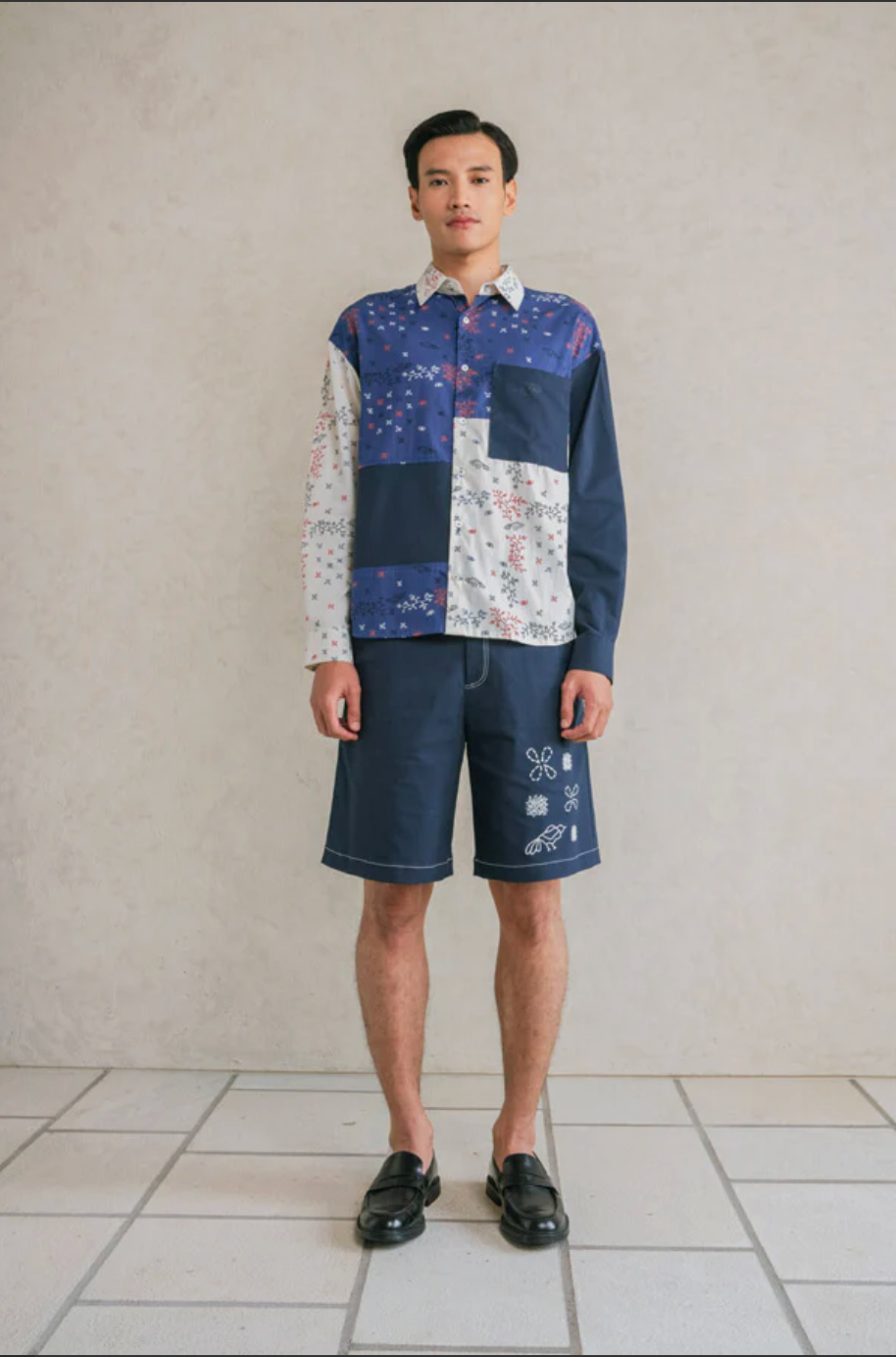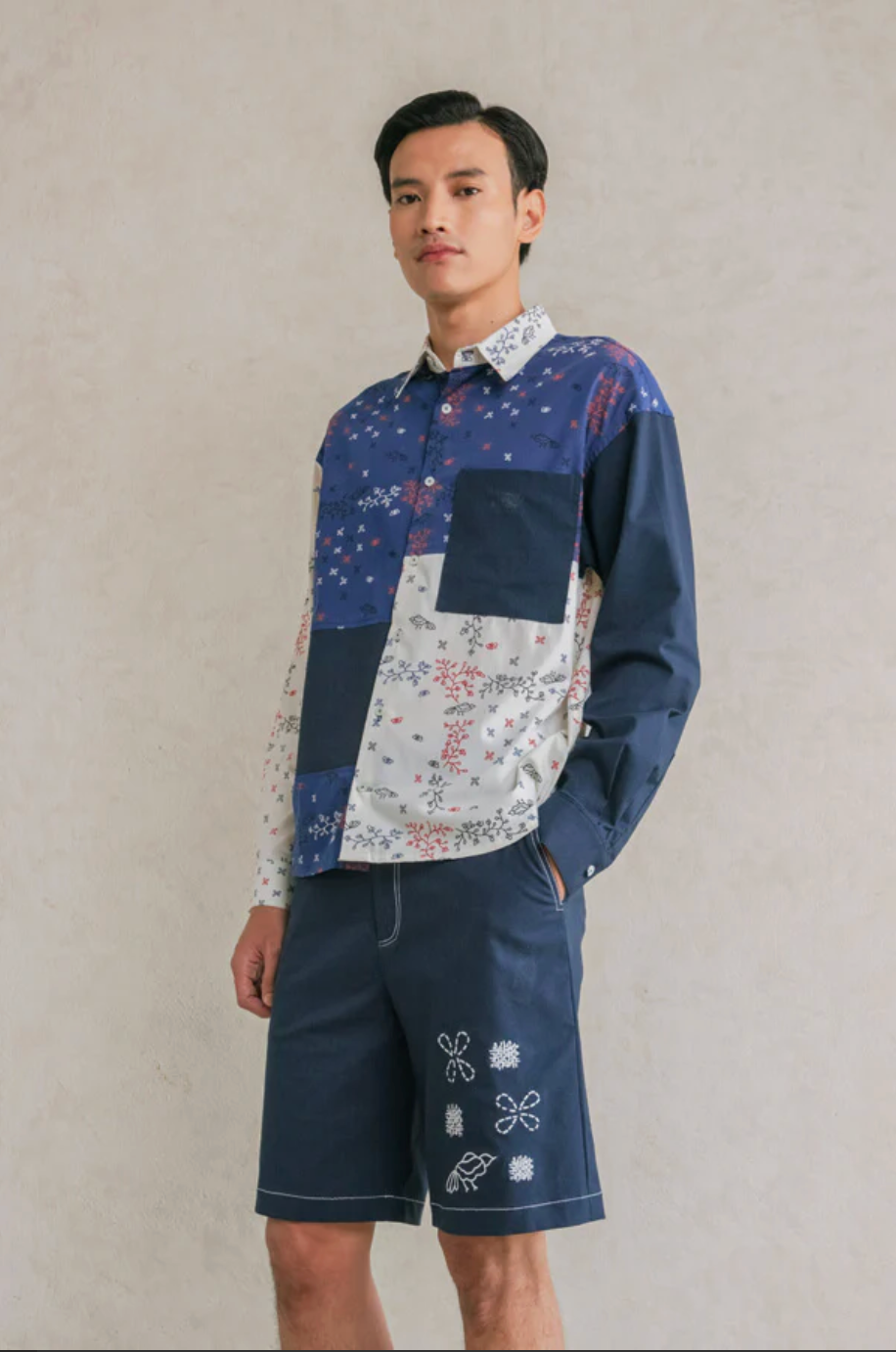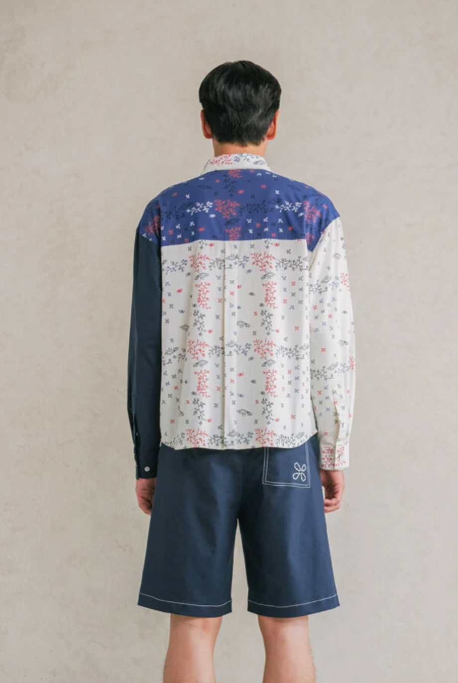 異なる柄の生地を組み合わせたパッチワークデザインが印象的なロングスリーブシャツ。