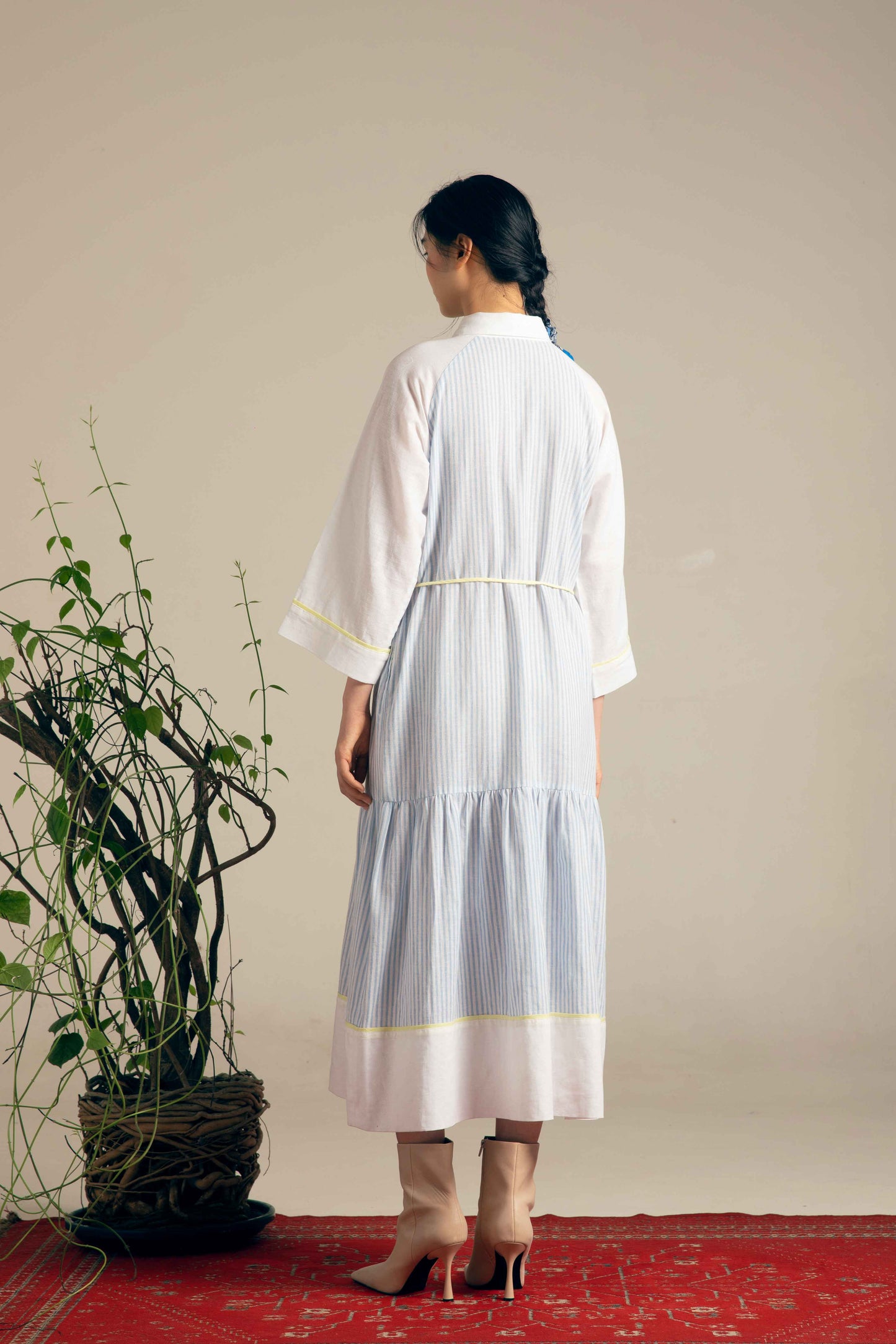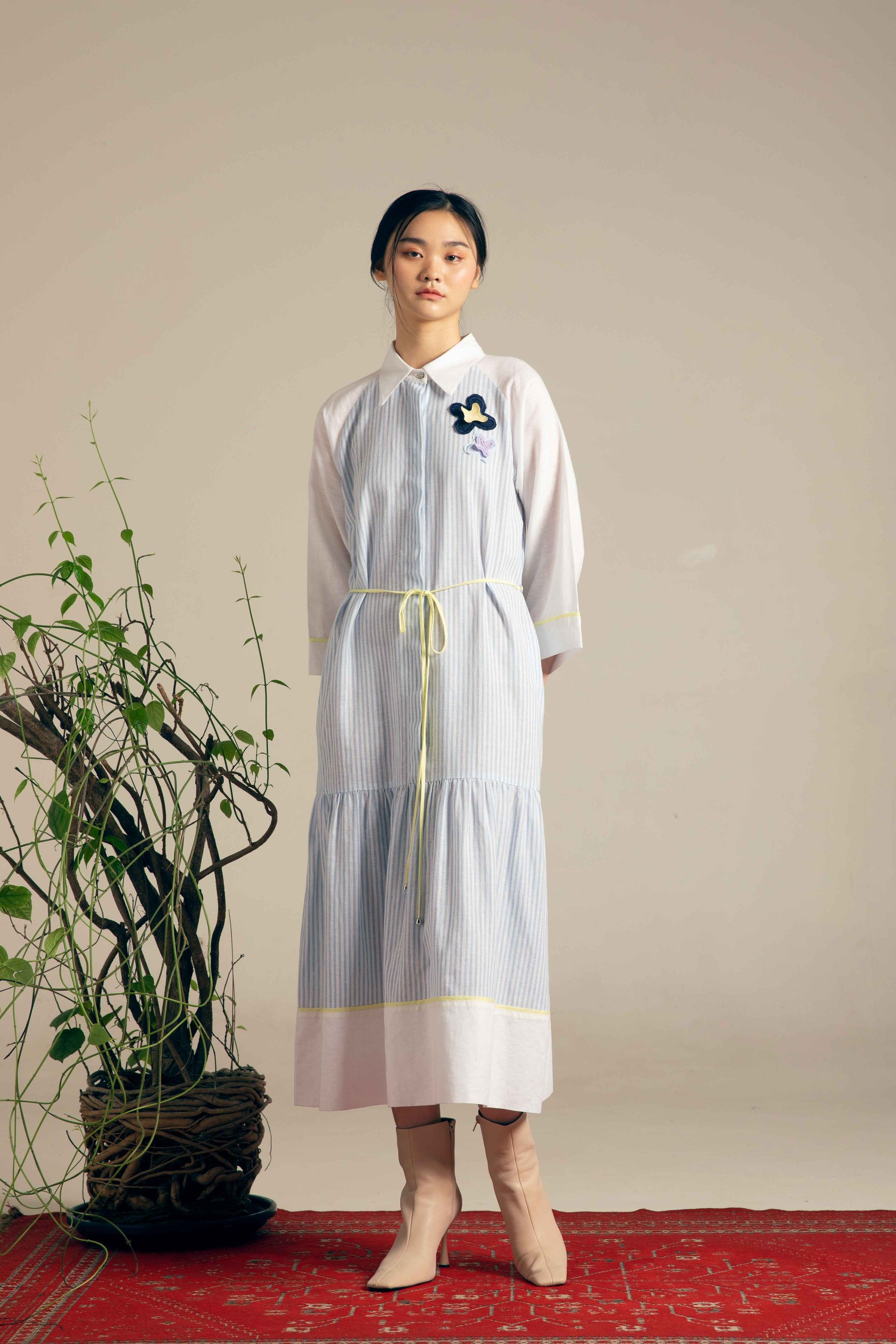 クラシックなシャツドレスのシルエットに、繊細なストライプ柄とフェミニンなディテールを加えたエレガントなドレス。