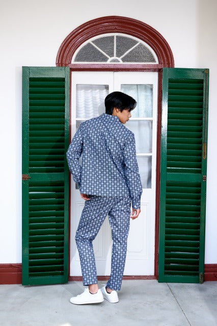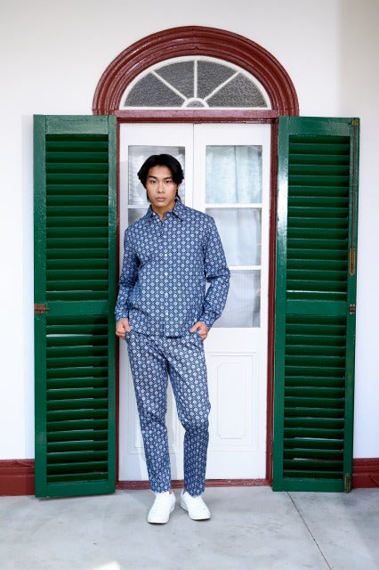 全体に施されたオリエンタル調の柄が印象的で、クラシックなデザインと現代的なセンスを融合させたロングスリーブシャツ。