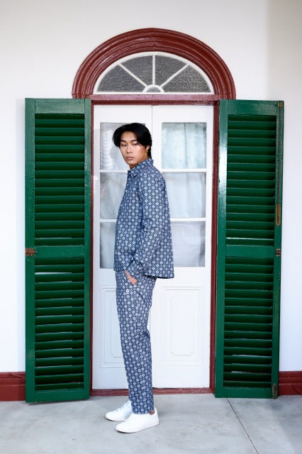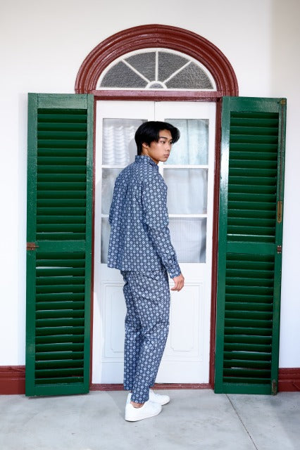 襟付きのベーシックなロングシャツスタイルに、オリエンタルな柄をあしらうことで独自の存在感を演出します。
