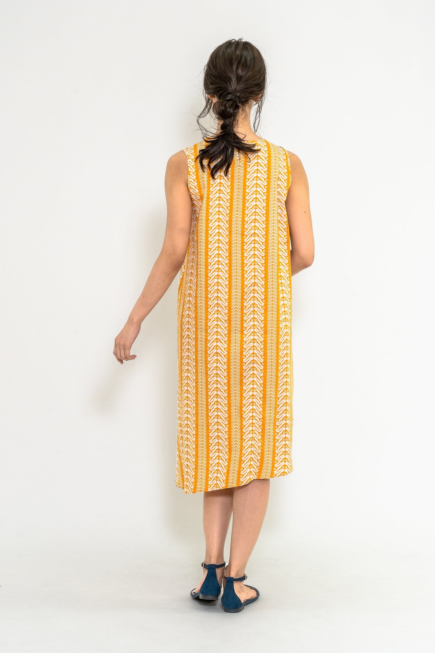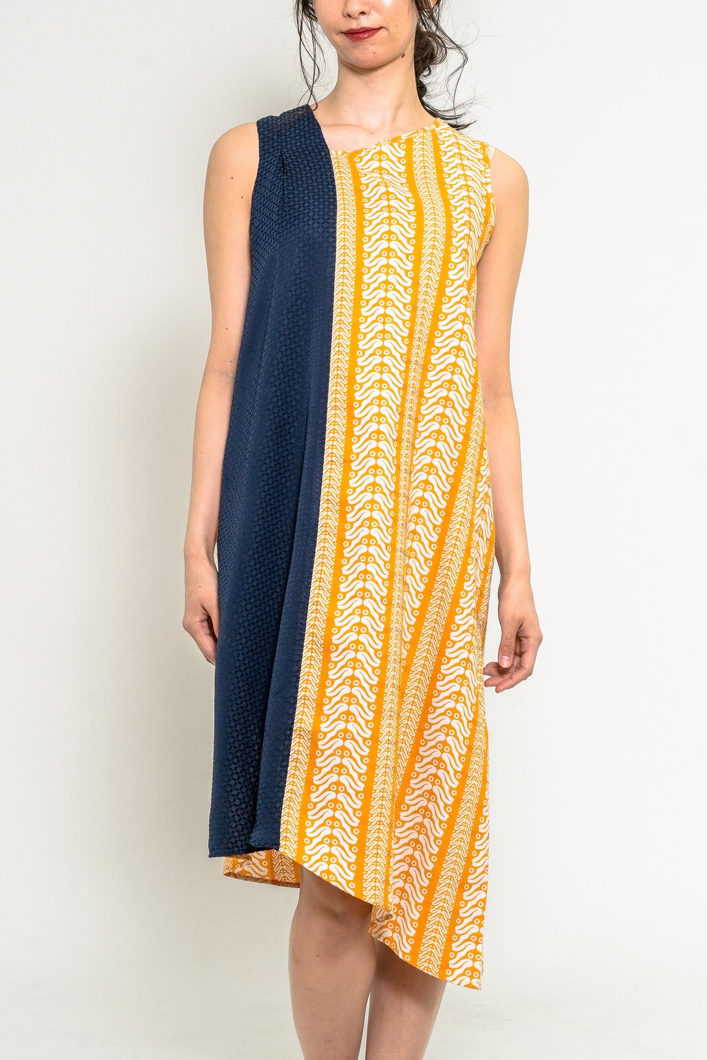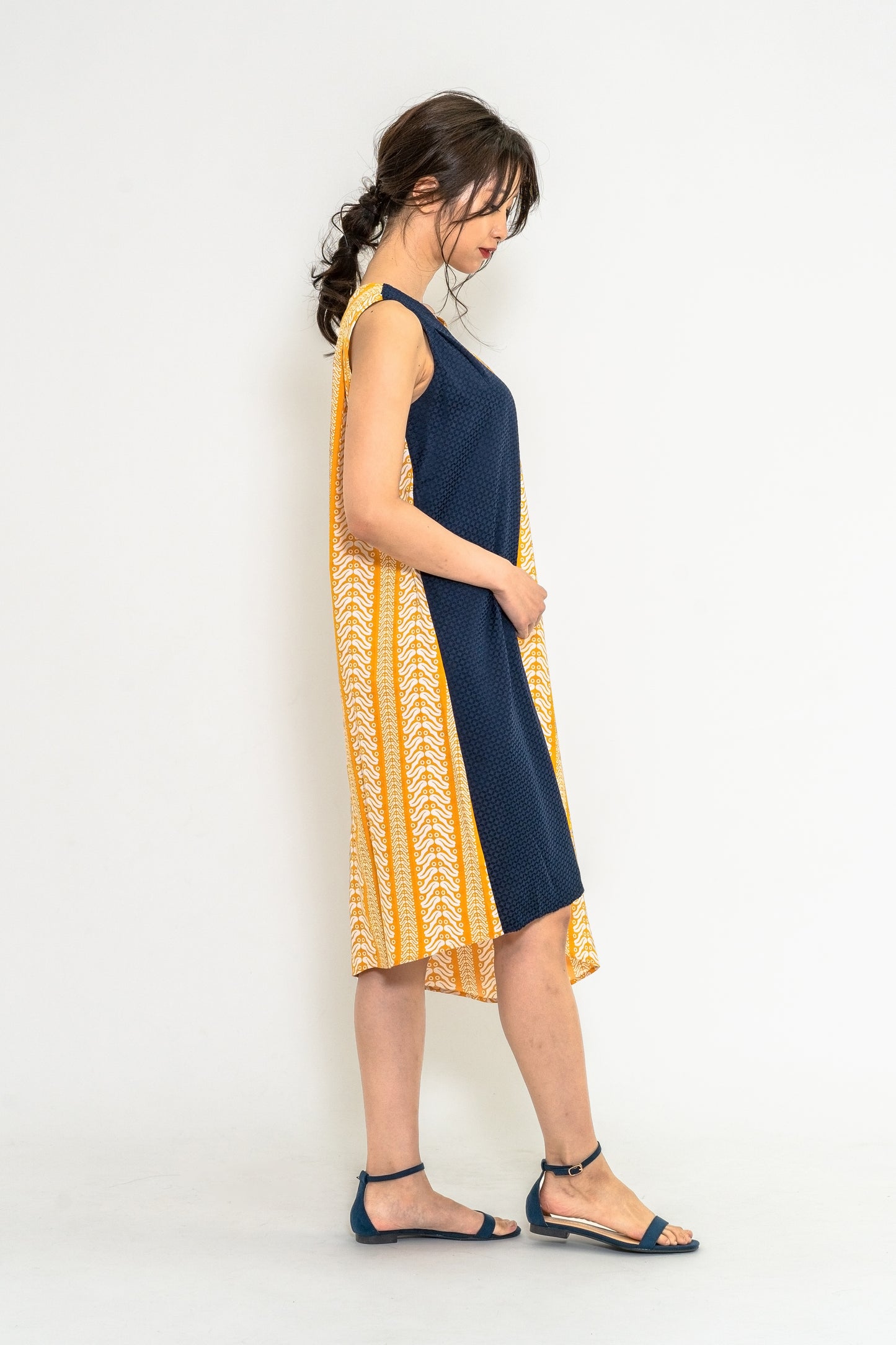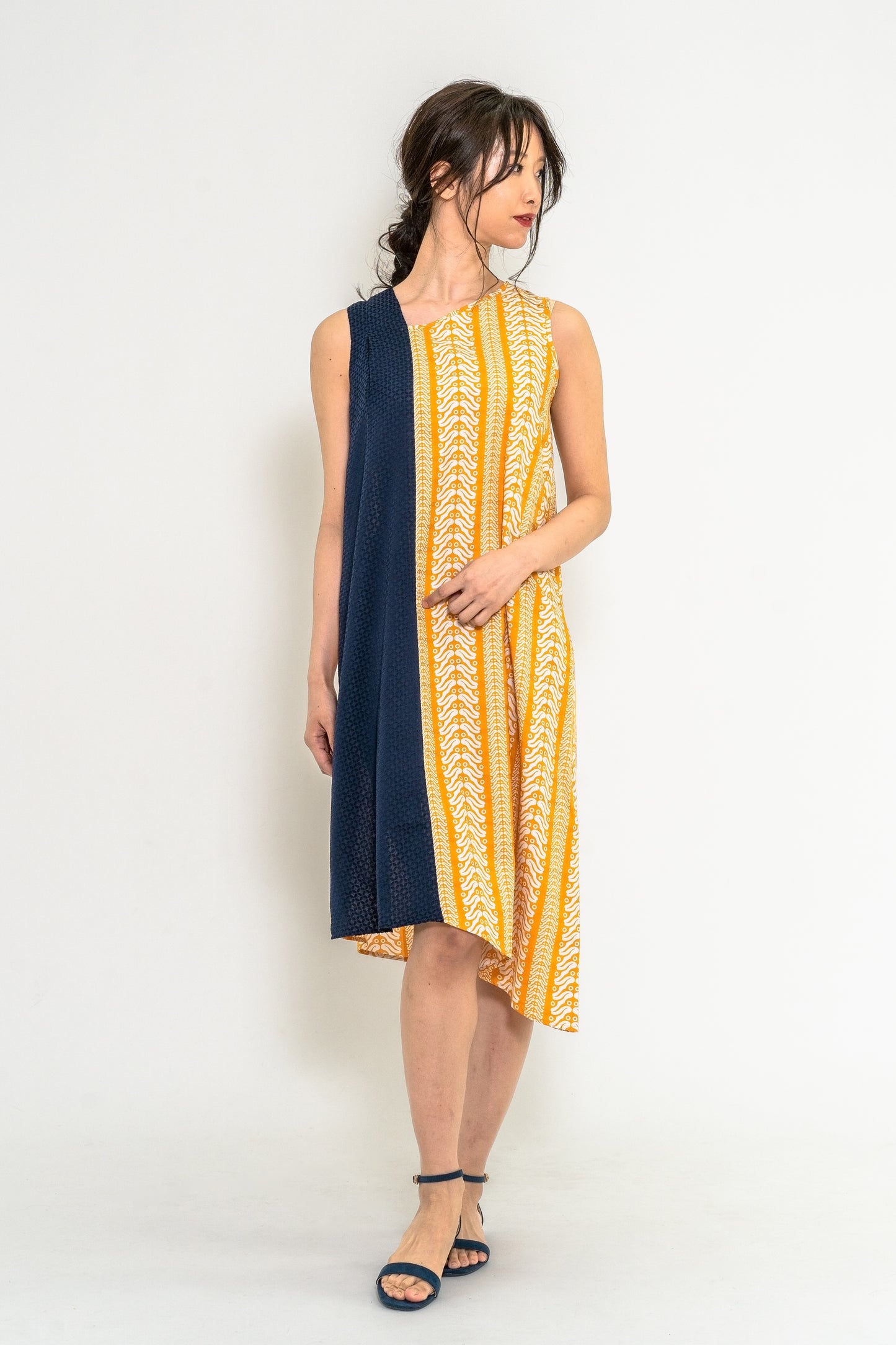 大胆な色の切り替えが目を引く、モダンでアートフルなノースリーブワンピース。