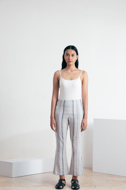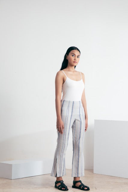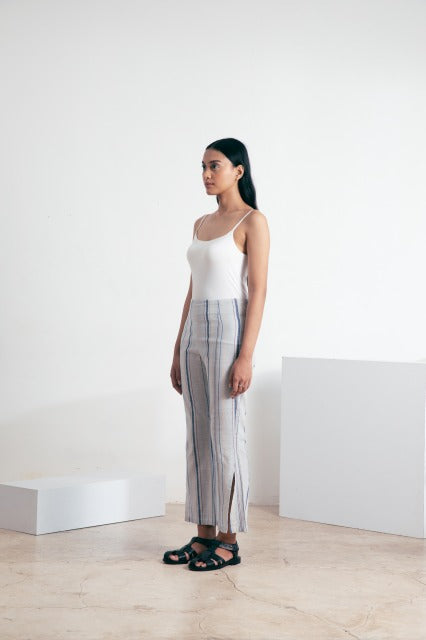 ブルーとホワイトを基調とした爽やかなストライプ柄が、縦のラインを強調し、脚を長くすっきりと見せてくれます。品のある柄で、スタイル全体に洗練された印象を与えます。