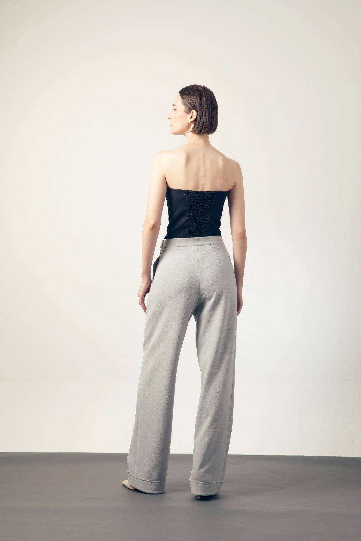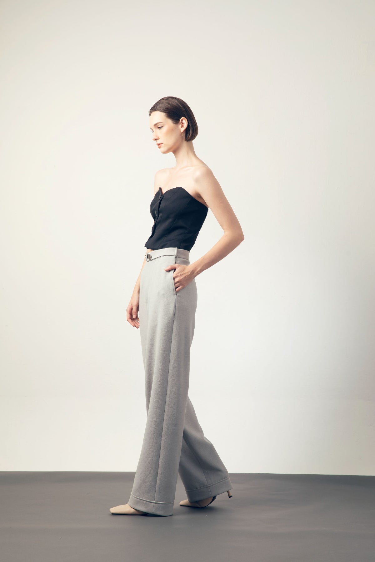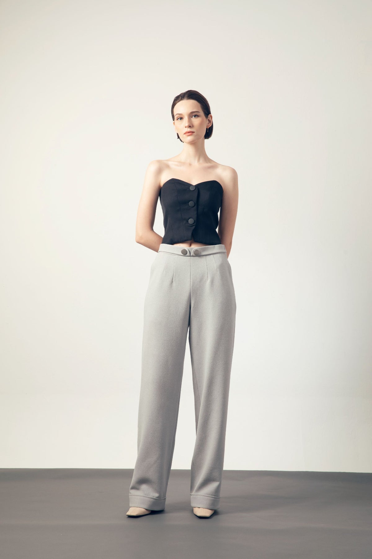 ウエスト部分が短めにカットされ、ハイウエストのボトムスと合わせることで、バランスよくスタイルアップが可能です。